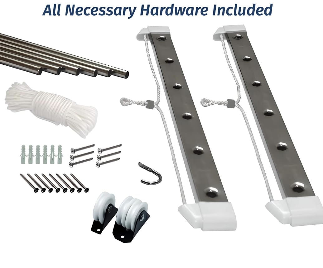 UNIQUE FEATURES -HIGH QUALITY PULLEY MECHANISM HELPS MOVING THE RACK UP AND DOWN CONVENIENTLY. HIGH QUALITY STAINLESS STEEL ENSURES A VERY LONG PRODUCT LIFE. NYLON ROPE USED IS UV PROTECTED WHICH MAKES PRODUCT DURABLE.
